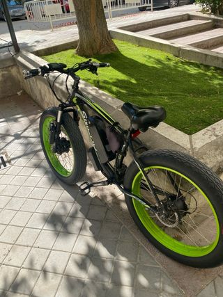 Bicicleta eléctrica estilo Fat Bike con ruedas anchas y diseño moderno. - Cuadro robusto. - Ruedas de gran tamaño. - Sillín cómodo. - Portaequipajes trasero. - Frenos de disco hidráulico Amortiguacion delantera y trasera hidráulica. Frenos hidráulicos. La bicicleta se a comprado este año y esta nueva, tiene solo 1.165km . La batería te hace por cada carga modo pedaleo de 120 -150 km cada carga y eléctrico puro 80-90km.