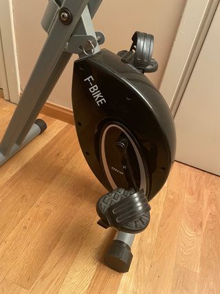 Bicicleta estática desmontable con muy poco uso. Funciona perfectamente, con sillín con altura regulable, bridas en los pedales para mayor comodidad y ruleta para controlar la dureza. También tiene pantalla LCD con control de tiempo, kilometraje y ritmo.