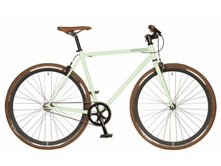 Bicicleta Kamikaze estilo Fixie en color verde menta con detalles en marrón. Tamaño de la rueda: 622 milímetros Tamaño M 530 Llantas de aluminio 28-622 (700c) con llantas de perfil de 40 mm - Cuadro de bicicleta. - Ruedas con llantas negras y cubiertas marrones. - Sillín de cuero marrón. - Manillar negro con puños marrones.
