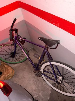 Bicicleta estilo fixie en color morado. Ideal para moverte por la ciudad con estilo. Funciona muy bien, lleva para muchos meses por que ya no la uso. - Cuadro de bicicleta morado. - Rueda delantera con aro verde. - Rueda trasera con aro blanco. - Pedales negros.