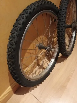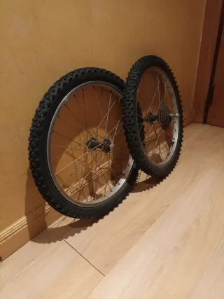 Juego de llantas completo para bicicleta de 20 pulgadas. En buen estado general. Cassette de 5 piñones. Se pueden vender sin cassete o cassette desmontado. Clásica, antigua, retro, vintage, chopper, custom, paseo, plegable, infantil, bh, orbea, gac, torrot, derbi, bmx, fixie, mtb, urbana