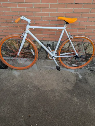 Bicicleta tipo fixie, ideal para desplazarse por la ciudad. - Cuadro de color blanco. - Ruedas y sillín de color naranja. - Manillar naranja.
