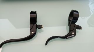 manetas de freno para fixie negras. ambas son derechas y ambas tienen la abrazadera de 31,8. tiene diferente forma. se venden juntas