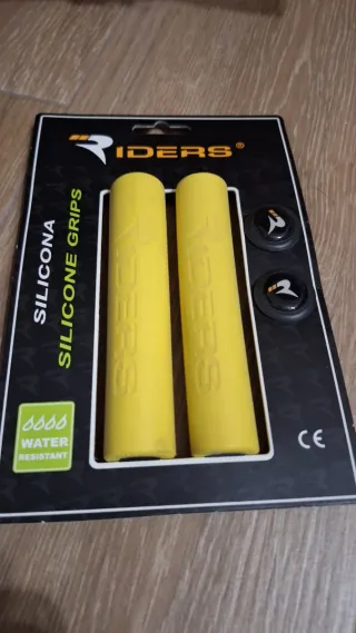 Puños de silicona para bicicleta de la marca Riders, modelo R100. Son resistentes al agua. - Color amarillo. - Material: Silicona. - Incluye tapones. Tal como se ver en la foto se puede ver sin compromiso Me PUEDO DESPLAZAR DE PRENDE DE LA ZONA XT FOCUS MENDI KTM XTR ORBEA BH TREK