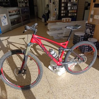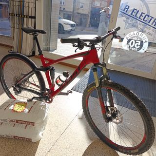 Bicicleta de montaña Ghost SLAMR 6.9 en talla L y color rojo. - Cuadro de carbono , basculante aluminio. - Suspensión delantera RockShox Reveletion 130mm - Amortiguador trasero Roxkshox Sid Luxe Ultimate 130mm con control remoto - Frenos de disco hidráulicos Shimano XT - Discos XT - Transmisión SRAM NX - Ruedas de 29 pulgadas Hunt XC ligeras - Pedales automáticos XT - Peso aproximado 13,8 kg - Cubiertas Specialized Butcher y Ground Control - Sillin Specialized Avatar