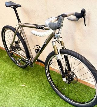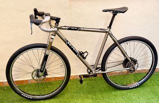NEGOCIABLE... VERVE de SEVEN CYCLES USA gravelizada, hecha a mano con TITANIO INTEGRITY 325’. 11,5 kg. Talla XL ( 60 tubo horiz. x 57 t. sillín ) hasta 1,95 m. Horquilla WHITE BROTHERS BW 1.0 con aire, bloqueo manual y rebote. Potencia Thomson y manillar Gravel aero con cinta BONTRAGER y cableado interno. Dirección CHRIS KING. Tija Thomson y sillín ARVADA de BONTRAGER. Transmisión 1 x 11 vel. SRAM FORCE / X9. Frenos hidráulicos SRAM 160/160 mm. Ruedas 29 con llantas SALSA, bujes Shimano XT y radios DT SWISS. Bielas Shimano. Pedales mixtos XT. Cubiertas Gravel 29 x 1.95 NUEVAS. Portabidones de carbono. Merlin, Litespeed, restomod