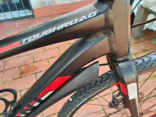 Bicicleta híbrida Giant Toughroad en color negro y detalles en rojo. - Cuadro de aluminio. - horquilla carbono - Ruedas de 700c. - Frenos Shimano xt - Portaequipajes trasero tubus. - transmisión Sram eagle 1 x 12 - talla s Entrego las cubiertas de origen sin usar. No cambio.