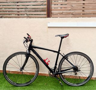 SPECIALIZED CROSSOVER SPORT de aluminio. 9,90 kg. Talla L ( 58 cm. t. h. y 48 t. sillín ) hasta 1,80 m. Ruedas 700c SPINERGY XAERO, Radios PBO Power únicos: fibras de polifenileno ultraligeras y duras que palian vibraciones y mejoran la respuesta. Cubiertas Specialized 700x38c. Manetas y levas AVID v brake. Hoquilla de carbono Specialized FACT. Transmisión 2 x 9 vel. SORA, desviador shimano 105. Bielas Rotor AGILIS. Cableado nuevo. Manillar y potencia CANNONDALE con puños de silicona nuevos y acoples. Tija de carbono y sillín Scape. Pedales de plataforma y portabidones. Regalo radio de fibra nuevo. Gravel, commuter, híbrida, urbana