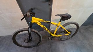 Vendo bicicleta de montaña Specialized Rockhopper amarilla con cuadro de aluminio M4. Es una bici con buenos componentes, base ideal para quien quiera empezar. Horquilla: RockShox Tora (suspensión de aire/muelle de lo mejor para iniciacion). Transmisión: Cambio trasero Shimano Deore XT y delantero Deore Frenos: Frenos de disco hidráulicos Shimano, la maneta izquierda es la original. Pedales mixtos: Doble cara, compatibles con calas. Estado actual: La bicicleta funciona, pero requiere mantenimiento para dejarla perfecta, la rueda trasera esta bastante gastada. Y tiene algun tornillo oxidado.