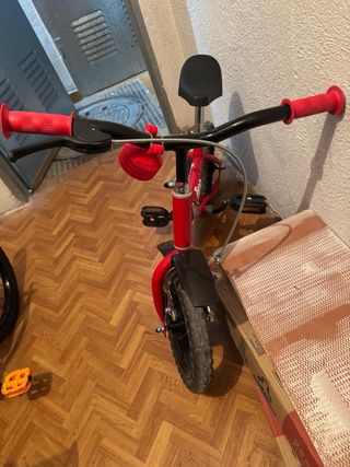Bicicleta de aprendizaje en color rojo y negro, ideal para los primeros pasos sobre ruedas. - Marco de metal resistente. - Ruedas de goma. - Manillar ajustable.Con algún roze del uso, como una goma del manillar. De lo demás perfecta