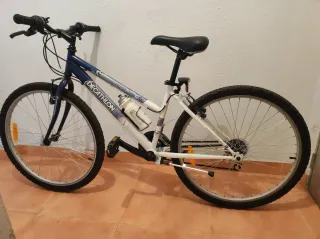 Bicicleta Decathlon Rockrider 5.0 en color blanco y azul, ideal para jóvenes. Se entrega inflada. Ruedas de 26 pulgadas.
