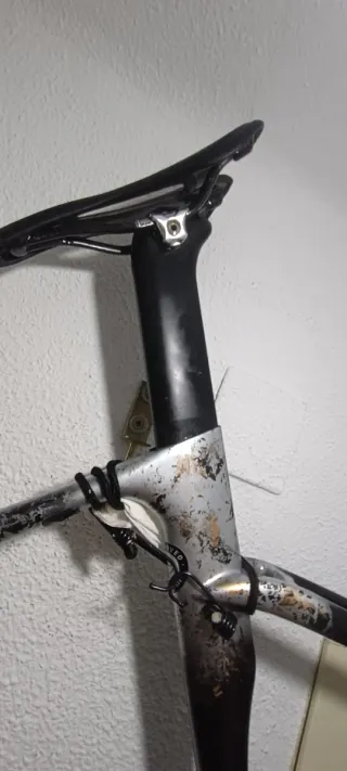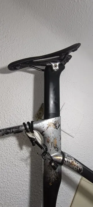 Cuadro de bicicleta aero. Se le puede poner cambio electrónico. Presenta un diseño aerodinámico de carbono talla 58. Se vende con sillín de carbono y con manillar de carbono de 420mm y potencia KTM, y se da otra potencia specialized, eje de pedalier nuevo todo por 250€, y con las ruedas cosmic de 40mm 300€. No hago envíos - Material: Carbono - Color: Negro y plateado con detalles dorados - Diseño: Aero