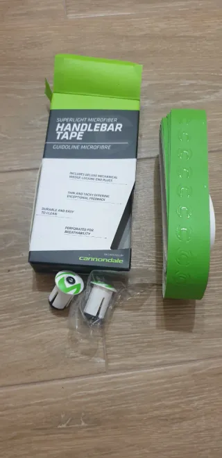 Cinta de manillar Cannondale Superlight en color verde. - Material de microfibra. - Incluye tapones de extremo mecánicos. - Acabado fino y adherente. - Perforada para transpirabilidad. Tal como se ver en la foto se puede ver sin compromiso ME PUEDO DESPLAZAR DE PENDE DE LA ZONA XT FOCUS MÉRIDA MENDY KTM TREK XTR ORBEA BH