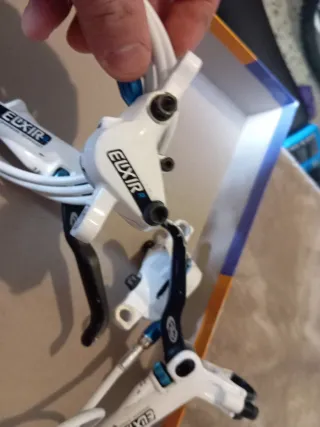 Juego de frenos de disco para bicicleta de montaña. Con algunas marcas de uso pero perfecto funcionamiento - Marca: Elixir R - Color: Blanco y negro - Incluye manetas y latiguillos CONOR ORBEA LAPIERRE CANYON KTM FOX RITCHEY FELT MONDRAKER SCOTT FSA BH