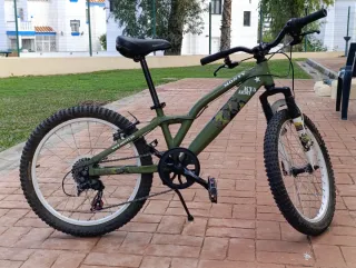 Bicicleta Monty KX5 de color verde, ideal para niños. Nueva costó 315€. - Ruedas de aluminio de 20" x 1,75 (14G x 36H, válvula A/V. - Peso 12,05kg. - Transmisión: 1 plato / 6 piñones/ cambio trasero Shimano TY21 (6 velocidades) - Manetas de cambio en plástico y aluminio - Frenos V-Brake ( aluminio L100mm). - Bielas: 36T, 144mm, 1/2" x 3/32" con protector Disponible en dos colores (azul y verde). Si se compran juntas precio negociable.