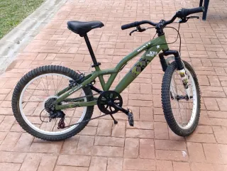 Bicicleta Monty KX5 de color verde/azul, ideal para niños. Nueva costó 315€. - Ruedas de alumini de 20" x 1,75 (14G x 36H, válvula A/V. - Peso 12,05kg. - Transmisión: 1 plato / 6 piñones/ cambio trasero Shimano TY21 (6 velocidades) - Manetas de cambio en plástico y aluminio - Frenos V-Brake ( aluminio L100mm). - Bielas: 36T, 144mm, 1/2" x 3/32" con protector - Disponible en dos colores (azul y verde). Si se venden juntas precio negociable.