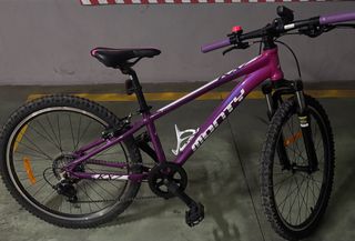 Bicicleta infantil Monty de color morado, modelo KX7. Ideal para iniciarse en el ciclismo. - Cuadro de aluminio. - Frenos V-Brake. - Suspensión delantera. - Ruedas de 20 pulgadas.