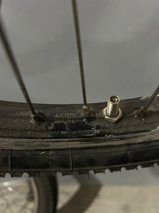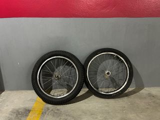 se vende juego de llantas akront biketrial. ideales para restaurar tu vieja T219 o B219 las llantas estan en buen estado y funcionales, con los bujes y rodamientos limpios y engrasados, el piñon tambien esta limpio y engrasado, pero seria recomendable cambiarlo si se le quiere dar un uso diario, y los neumaticos pirelli originales estan algo cuarteados ya que tienen sus años, pero para una bicicleta de exposicion estarian bien...