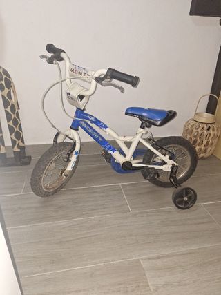 Bicicleta infantil Monty en buen estado, ideal para niños pequeños. - Marca: Monty - Modelo: 16" - Incluye ruedines - Color: Blanco y azul