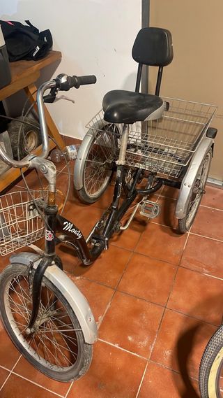 Triciclo de la marca Monty, ideal para paseos y transporte. - Cesta delantera y trasera. - Asiento con respaldo. - Ruedas de 20 pulgadas.