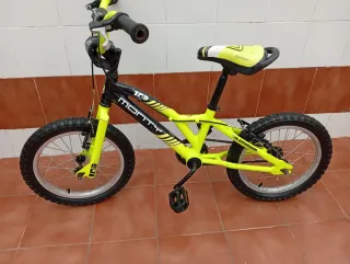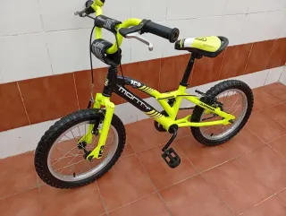 Bicicleta infantil de la marca Monty, modelo 103. Ideal para los más pequeños de 4 a 7 años - Color amarillo neón y negro. - Ruedas de 16 pulgadas. - Sillín acolchado. - Manillar con puños de goma. La bicicleta funciona perfectamente solo tiene una pequeña rozadura en el sillín por lo demás está todo en perfecto estado se puede ver sin compromiso