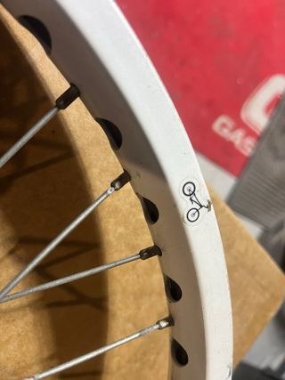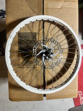 Llanta de bicicleta de trial de 20 pulgadas. Presenta un acabado blanco y radios con detalles rosas. - Llanta de 20 pulgadas. - Color blanco. - Radios con puntas rosas.