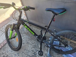 Bicicleta decathlon B-twin. Hasta 7 años más o menos. Altura mínima del sillín 55 cm y máxima unos 77. Altura del manillar 83 cm. Diametro de la rueda 49 cm. En perfecto estado..solo unos pequeños rallones