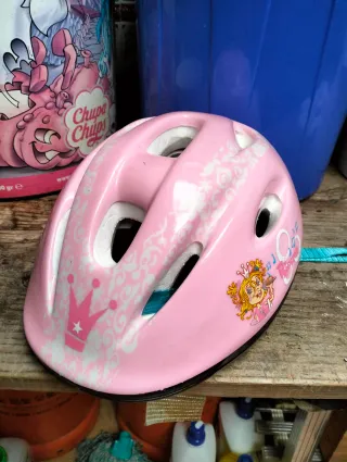 Casco de bicicleta para niña en color rosa con decoración de princesas, con un diseño de princesas y coronas. Del Decathlon marca btwin. - Diseño con dibujos de princesas. - Detalles de coronas y adornos. - Color rosa. - Edad 5 años.