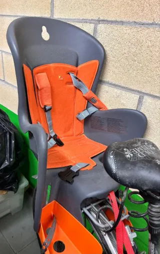 Silla para bicicleta diseñada para transportar niños de forma segura. - Asiento acolchado en color naranja. - Arnés de seguridad con correas. - Reposapiés con protectores laterales.