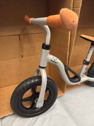 Bicicleta de equilibrio para niños de la marca Chillafish. Ideal para aprender a montar. - Marco de color gris. - Asiento y puños de color naranja. - Ruedas negras. Esta en buen estafo, las bieletas un poco rayadas con oxido superficial y la direccion con un poco de olgura.