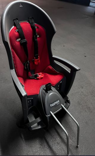 Silla de seguridad para bicicleta marca Hamax, con asiento rojo y negro. Para niños desde los 9 meses hasta 22 kg. Se vende con el sillín de bici. - Diseño ergonómico. - Cinturón de seguridad de 3 puntos. - Reposapiés ajustables uno de ellos sin cinta para ajustar.