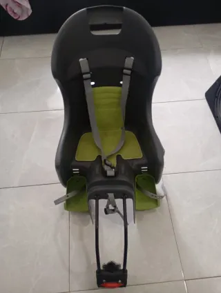 Silla para transportar niños en bicicleta. Diseñada para ofrecer seguridad y comodidad. - Asiento acolchado. - Arnés de seguridad de 3 puntos. - Reposabrazos laterales. - Estructura de plástico resistente. El soporte de fijación de la bicicleta no la acompaña. La última foto del anuncio es el soporte que puedes comprar en Decathlon