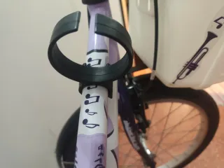 Bicicleta infantil de segunda mano, adecuada para niños de 6 a 9 años. Presenta un diseño divertido con notas musicales y un dibujo de trompeta. - Color principal: lila. - Incluye un portabebidas negro. - no incluye los ruedines .