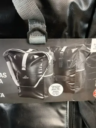 Producto Totalmente Nuevo ❗ Producto Totalmente Nuevo Envío por Wallapop Entrega en Alcorcón EL lote Incluye 2 Set de Alforja ( El total son 4 Mochilas) Capacidad de carga 20L Incluye Funda Protectora para la lluvia Bolsillo de Red lateral y Bolsillo frontal separado Fácil de fijar con 2 Ganchos y dos cierres Para bici con portaequipajes con varilla de hasta 12mm De Poliéster repelente al agua Tags # Decathlon, Orbea , Lidl , MTB