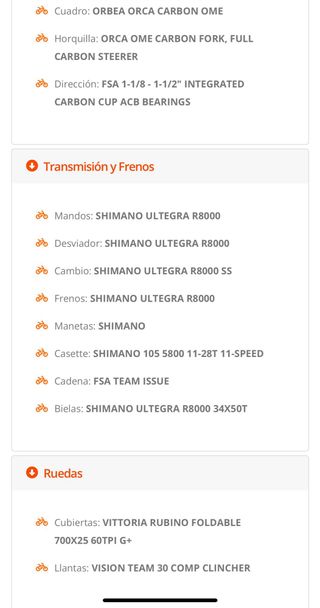 ORBEA ORCA M20 2017 Cuadro: Orbea orca OME Transmisión completa: Shimano Ultegra R6800 11v Platos y bielas: Shimano Ultegra 50/34 172,5mm Cassette: 11/32 u 11/34 (tengo dudas) Frenos: Shimano Ultegra Ruedas: Vision Team 30 Comp Cubiertas: Continental GrandSport y GrandPrix en buen estado. Talla: 55 Revisión y mantenimiento reciente completo: cambio de cassette, platos, cadena, sirgas y fundas.