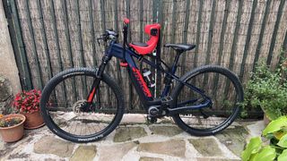 Bicicleta eléctrica Orbea Keram en color azul con silla infantil roja. Talla L: 174cm a 187cm Motor Bosch Active Line Batería 400Wh Kilometraje 800 Cuadro Aluminio Tamaño De Rueda 29" Cambio Shimano Deore Marca Del Cambio Shimano Tipo De Cambio Mecánico Velocidades 10 Velocidades Cassette 11-46-T Mandos De Cambio Shimano Deore Bielas OC Platos 34-T Frenos Shimano Mt200 Ruedas OC Material De La Rueda Aluminio Ejes Boost No Horquilla SrSuntour Recorrido De La Horquilla 100mm Bloqueo Remoto De La Horquilla No Material De La Potencia Aluminio Material Del Manillar Aluminio Tija De Sillín Aluminio Potenciómetro No