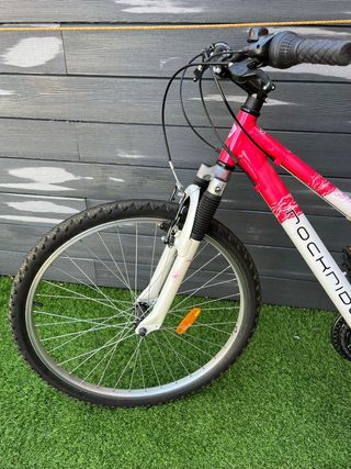 Bicicleta de montaña Rockrider 5.1 en color blanco y rosa. Como nueva, sin apenas uso. Con cambio de platos (3) y piñones (7) en puños. Muy fácil de manejar. Amortiguación delantera y sillín de gel para una comodidad máxima. - Cuadro de aluminio. - Ruedas de 24 pulgadas. - Frenos V-brake.
