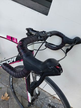 Bicicleta de carretera Merida Lite para mujer en talla XS. Diseñada para ofrecer un rendimiento ágil y cómodo. Ideal para una mujer de 160cm aprox. - Cuadro de aluminio - Dos platos y 8 piñones - Cambios Shimano - En buen estado. Sólo le falta una pieza de plastico embellecedora del freno (se ve en la foto). Usado para preparar y hacer 3 triatlones