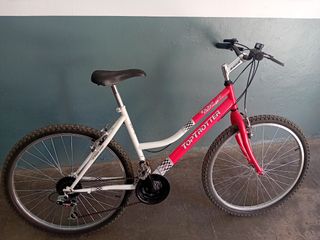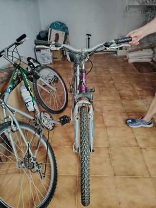 Bicicleta de montaña para mujer con ruedas de 26 pulgadas. Su diseño combina el color rosa con detalles blancos y florales, dándole un toque juvenil y atractivo. - Cuadro de 26 pulgadas. - Color principal rosa con diseño floral. - Incluye portabidón. Cambios de 21 velocidades con 3 platos y 7 piñones. Manetas Cambio de puño. 2 bicicletas iguales, 60 euros cada una, 110 si te llevas las 2. Se encuentra en un pueblo de Segovia.