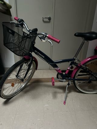 Bicicleta BTWIN en color azul marino con detalles en rosa. Ideal para paseos. - Cesta delantera negra. - Guardabarros trasero rosa. - Pata de cabra. - Puños y pedales en color rosa.