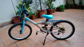 bicicleta infantil de la marca B'Twin con ruedas de 20 pulgadas. Tipo: Bicicleta para niña en principio aunque nosotros borramos y sacamos las pegatinas más de niña porque la uso nuestro hijo. Tamaño de rueda: 20 pulgadas. Colores: Beige y azul. Edad recomendada: Aproximadamente de 6 a 9 años