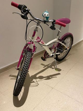 Bicicleta infantil Decathlon Btwin Misti Girl de 20 pulgadas. Ideal para iniciarse en el ciclismo. Se regala cesto para el manillar, luz trasera y ruedines - Cuadro de acero. - Frenos V-brake. - Ruedines desmontables. En muy buen estado, siempre en trastero. Perfecta para niños y niñas entre 6-12 años.