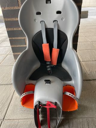 Concebido para transportar a un niño de 9 meses a 4/5 años (22 kg máx.). Se coloca en el portaequipajes de la bicicleta. Cuenta con sistema de fijación al cuadro de la bici Color beige. Cinturón de seguridad con 3 puntos de ajuste / ergonómico para usar casco / reposapiés ajustable. Está nuevo. Usado en apenas cinco ocasiones.
