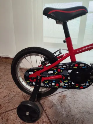 Bicicleta infantil de color rojo, ideal para los más pequeños. - ideal para niños de 3 a 5 años. - Incluye ruedines para facilitar el aprendizaje. - Diseño deportivo con detalles coloridos en la cadena.