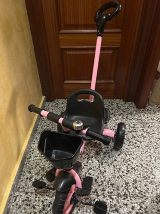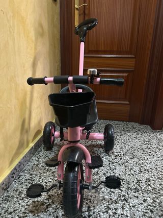 Triciclo de color rosa y negro, ideal para niños y niñas de 1 a 3 años. - Asiento cómodo. - Manillar con puños. - Cesta delantera. - Pedales. - Barra de empuje para adultos. Se a usado una vez fue un regalo de reyes y no le vale