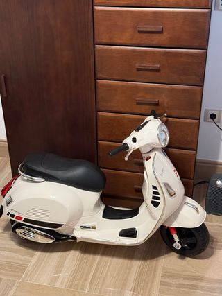 Moto eléctrica estilo Vespa para niños, ideal para edades de 3 a 6 años. Es un modelo de 6V y se encuentra completamente nuevo. - Diseño clásico y atractivo. - Color blanco crema. - Ruedas de goma para mayor agarre. - Detalles cromados.