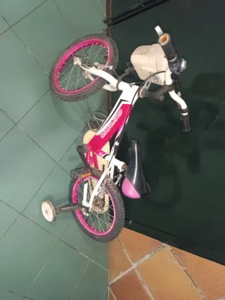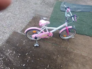 Bicicleta infantil de color rosa y blanco, ideal para niños de 3 a 7 años. Cuenta con ruedines para facilitar el aprendizaje. - Diseño con temática de princesas. - Ruedas de entrenamiento incluidas. - Manillar ajustable. - poner unos puños -limpiar un poco y listo Se usa prácticamente todos los días