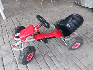 Divertido kart de pedales para niños de 3 a 7 años. Ideal para jugar al aire libre y desarrollar la motricidad. - Estructura robusta de metal y plástico. - Asiento ergonómico y ajustable a la altura del niño. - Ruedas todoterreno con cámara neumática. - Volante para dirigir. - Palanca para desembragar la transmisión. - Freno manual
