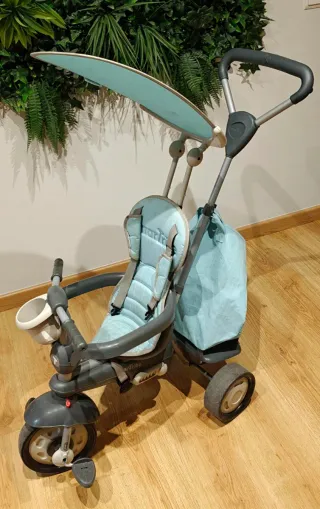 Triciclo evolutivo SmarTrike en buen estado. Ideal para niños de 10 meses a 3 años. Tiene 4 etapas de uso, adaptándose al crecimiento del niño: Primero con control de los padres mediante barra de empuje, y después el niño puede pedalear y conducir solo. Incluye sombrilla, cinturón de seguridad, barreras laterales, reposapiés, bolsito y cesta para juguetes. Muy robusto y cómodo para paseos. Medidas aprox.: 110 × 44 × 55 cm. Peso máximo recomendado: 17 kg.