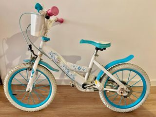 Bicicleta infantil Frozen en buen estado, ideal para niñas de 4 a 6 años. - Tamaño de rueda: 14 pulgadas - Diseño Frozen - Incluye cesta delantera - Asiento trasero